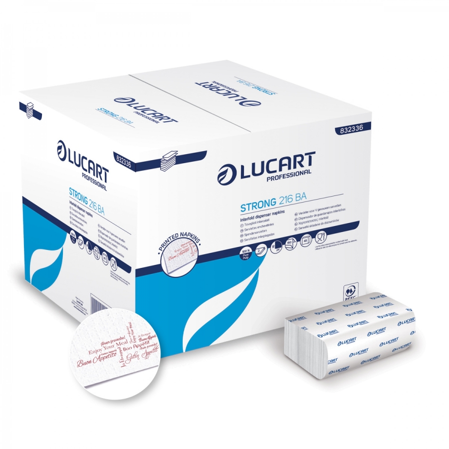 1 karton / 40  csomag / 6000 lap – 2 rétegű hófehér Buon Appetito – színes nyomattal. Kiváló minőségű olasz szalvéták . L-ONE adagolós hajtogatott szalvéták . Nagyon puha és  kellemes tapintású , erős szakítószilárdságú . A tiszta cellulóz ereje . A megoldás, amely a kiemelkedő teljesítményt kiváló minőséggel ötvözi.A Strong sorozat minden terméke a PEFC erdőgazdálkodási szabvány fenntarthatósági előírásainak megfelelően előállított 100% ban színtiszta szűz cellulóz rostokból készül.